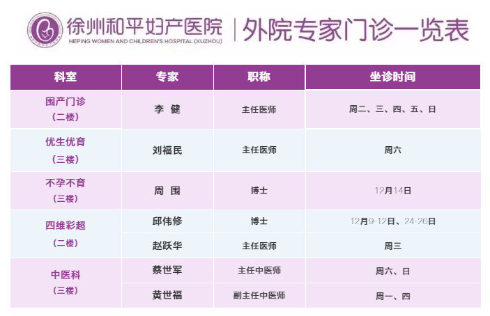 徐州和平妇产医院2019年12月9日—12月15日专家坐诊时间表,有需要的亲,赶紧预约哦~~